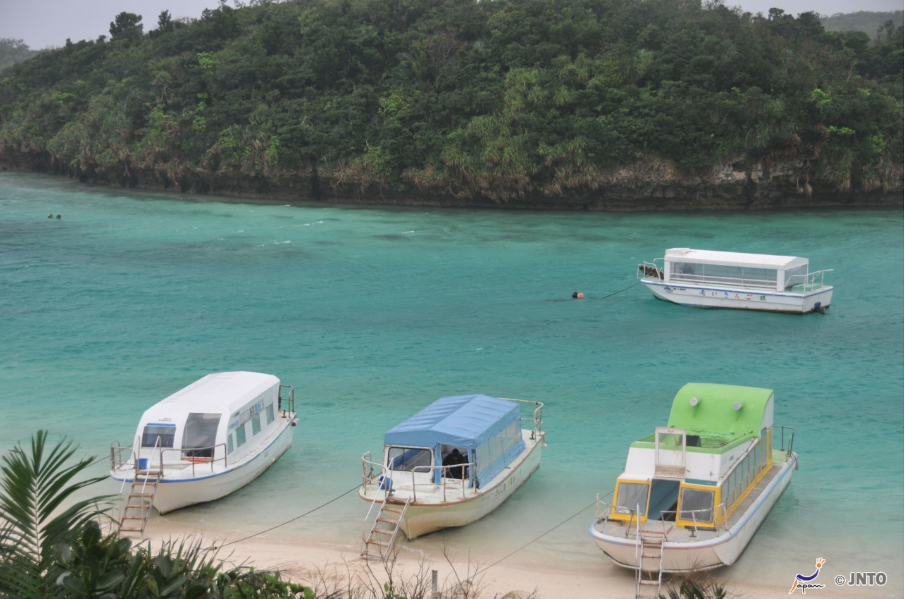 • 「カビラブルー」と呼ばれるエメラルドグリーンの海と真っ白な砂浜がある