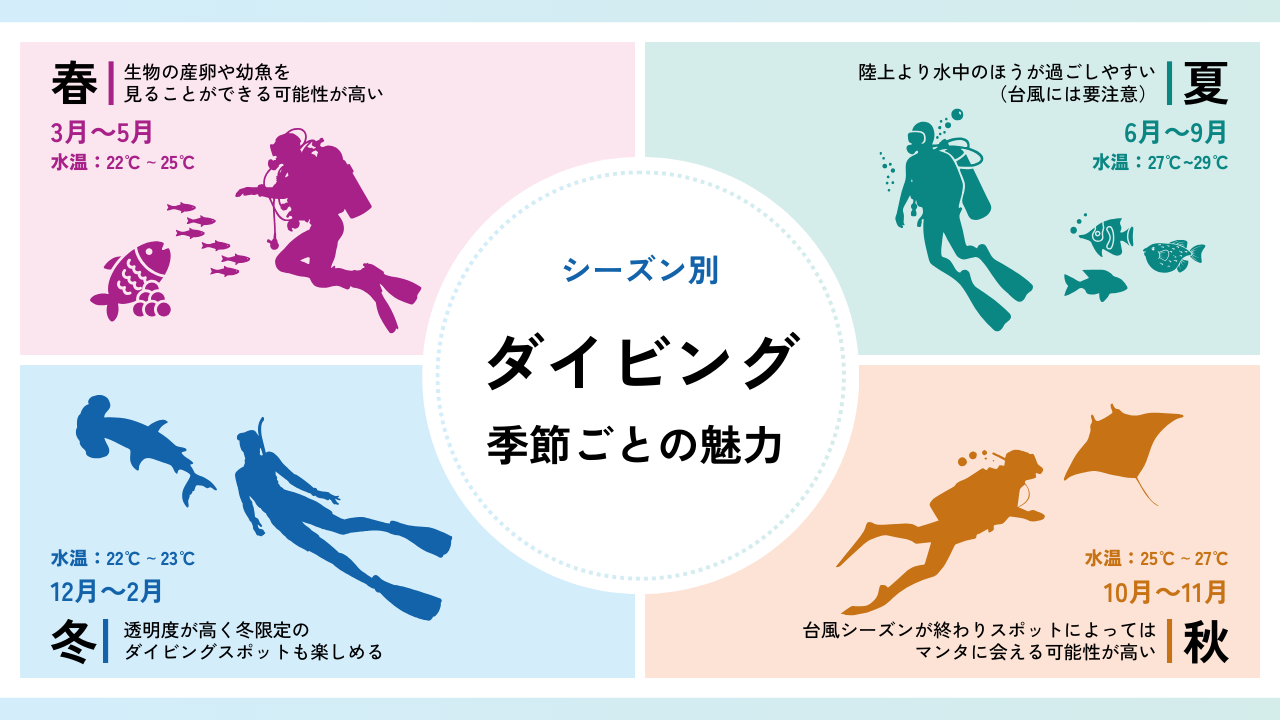 沖縄でのダイビングは季節によって見ることができる生物や水中の環境も異なることが特徴です。季節ごとの沖縄の海の水温、見ることができる生物、水中の環境やダイビングの楽しみ方は以下のとおりです。