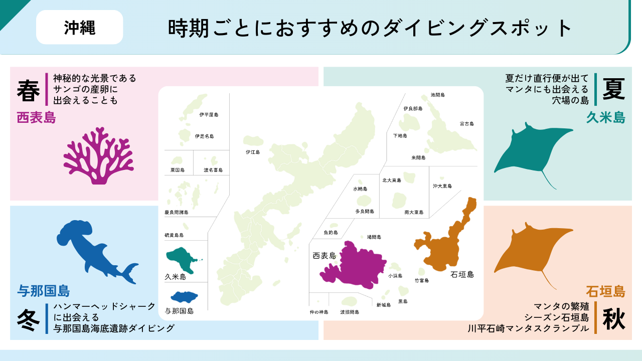 沖縄は以下のように時期によっておすすめのダイビングスポットが異なります。